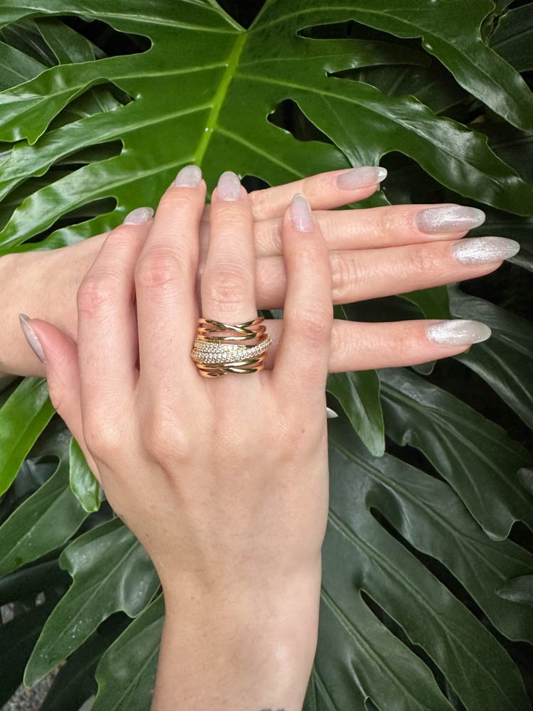 El anillo Galaxia combina aros superpuestos con incrustaciones luminosas que evocan el resplandor de las estrellas. Su diseño abierto y ajustable lo convierte en una pieza cómoda y versátil, perfecta para destacar en cualquier ocasión.