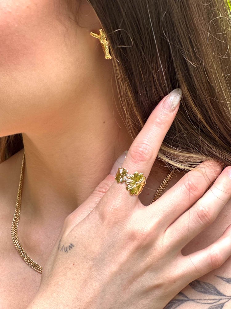 Anillo ajustable en rodio dorado con diseño de flores en relieve que transmiten frescura y feminidad.