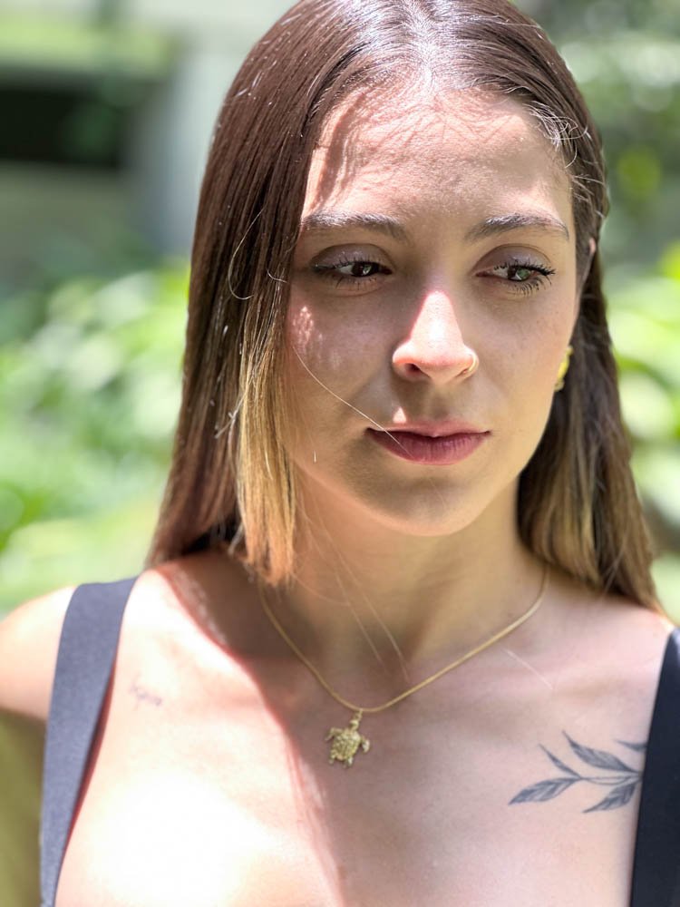 El collar Careyes combina una cadena fina de rodio dorado con un dije en forma de tortuga marina de acabado brillante. Con una longitud aproximada de 45 cm y un dije de 2,8 cm, es un accesorio delicado y a la vez llamativo, inspirado en la serenidad del océano.