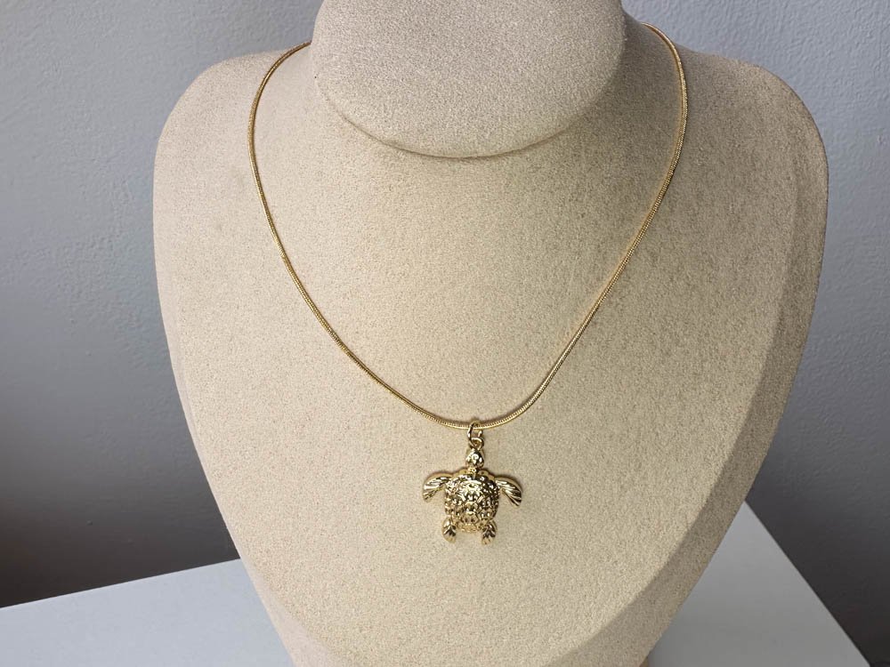 Cadena con dije de tortuga marina en rodio dorado que simboliza calma y protección.