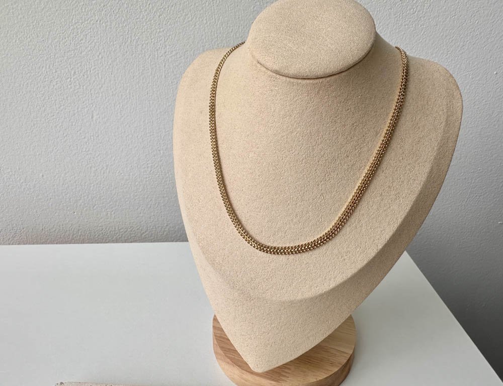 Cadena en rodio dorado de eslabón fino y tejido cerrado, elegante y versátil.