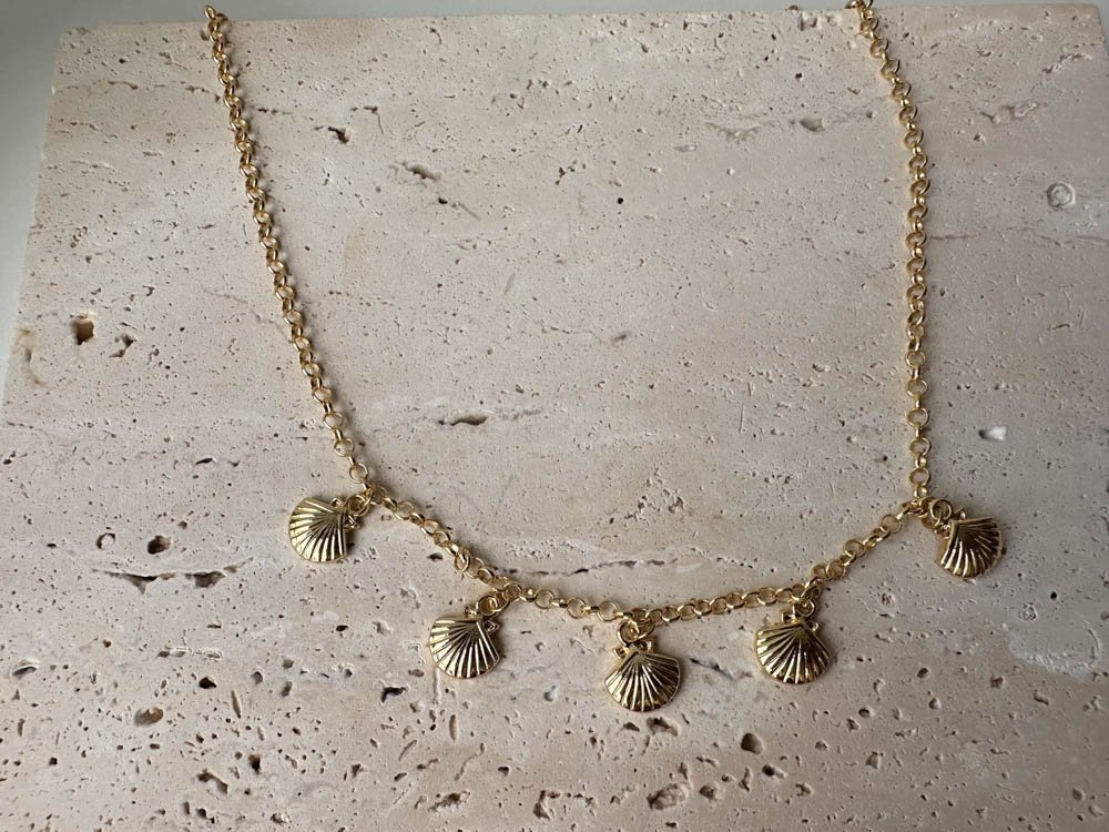 Cadena dorada con dijes de conchas, inspirada en la belleza natural del mar.