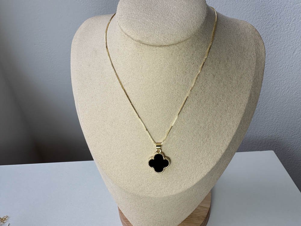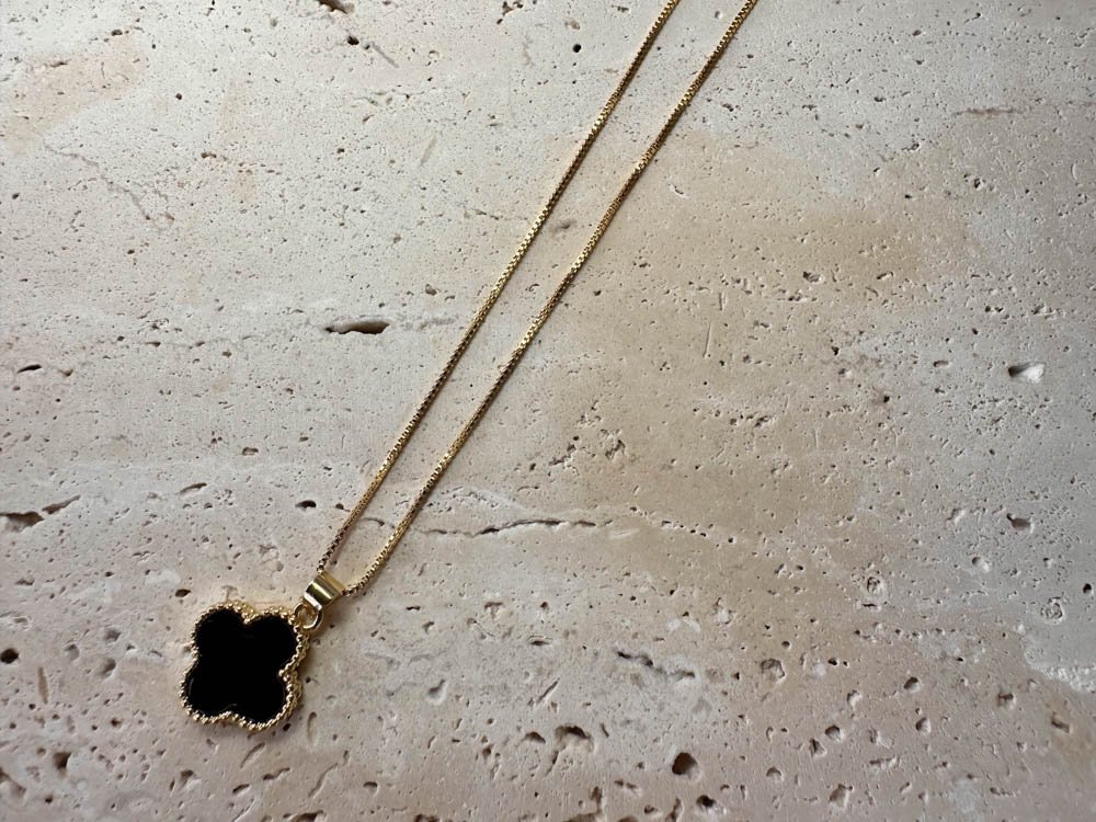 Cadena con dije en tendencia trébol negro enmarcado en dorado, elegante y atemporal.