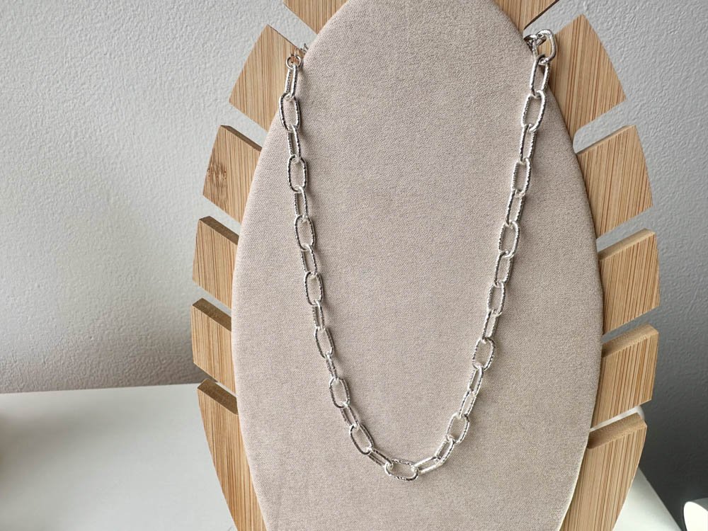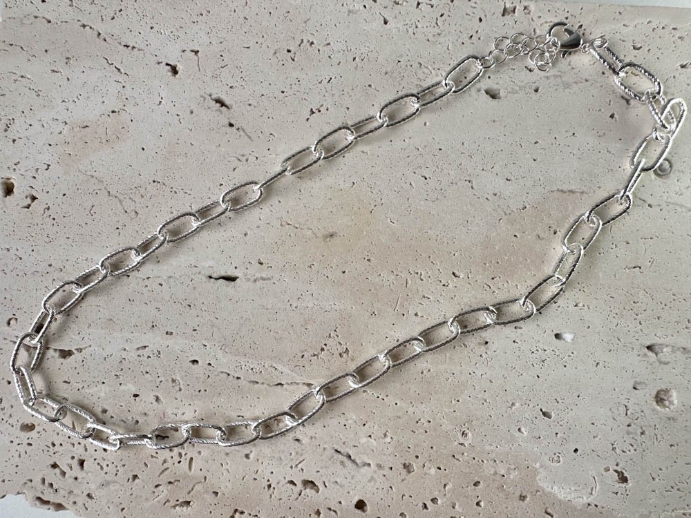 Cadena plateada de eslabones medianos y alargados, con acabado brillante y elegante.