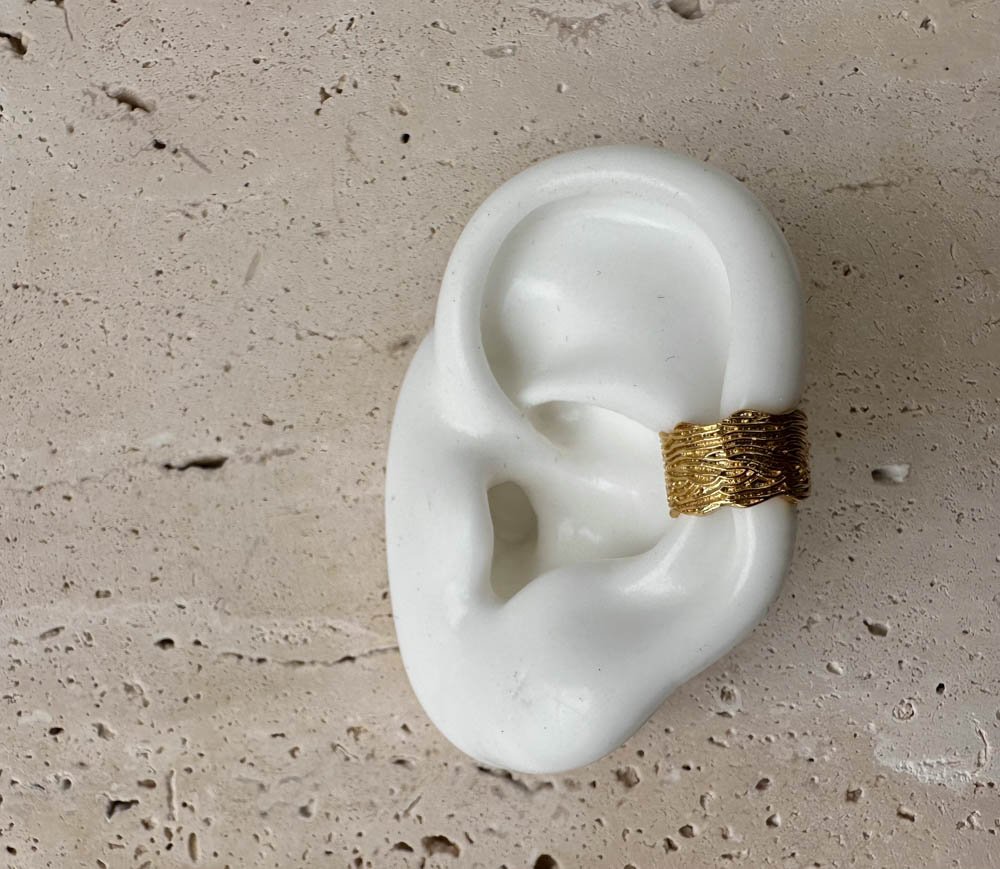 Earcuff en rodio dorado con acabado texturizado de estilo artesanal.