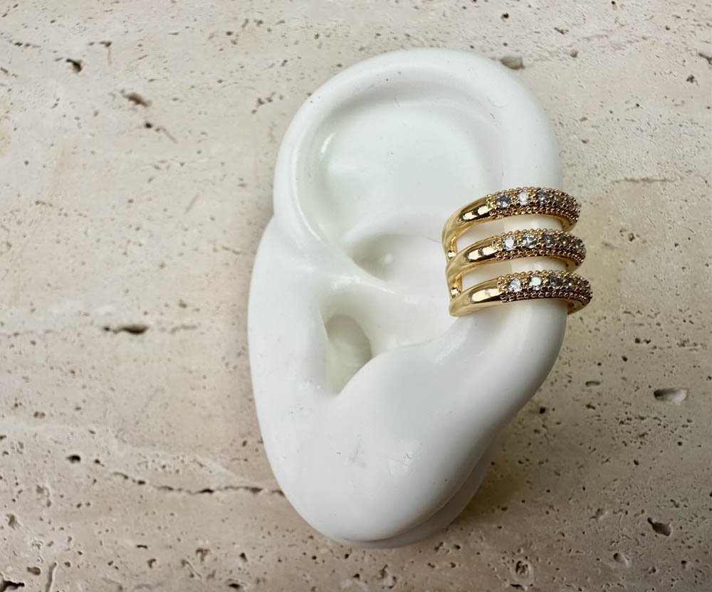 Earcuff en rodio dorado con tres líneas paralelas adornadas con incrustaciones brillantes.