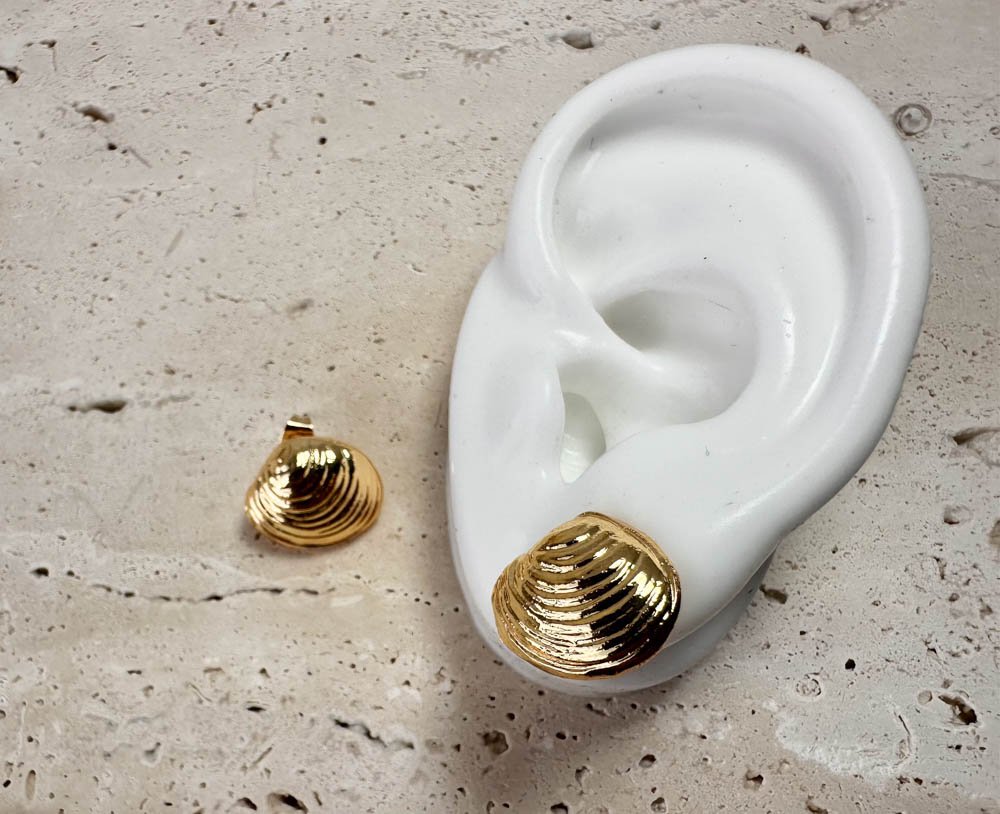 Los topos Concha Dorada recrean la silueta de una concha en relieve, resaltada por un acabado en rodio dorado brillante. Con un tamaño aproximado de 2 cm, son ligeros y versátiles, perfectos para añadir un toque marino sofisticado a cualquier atuendo.