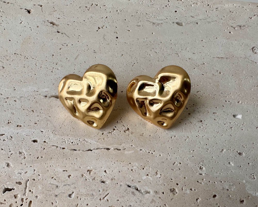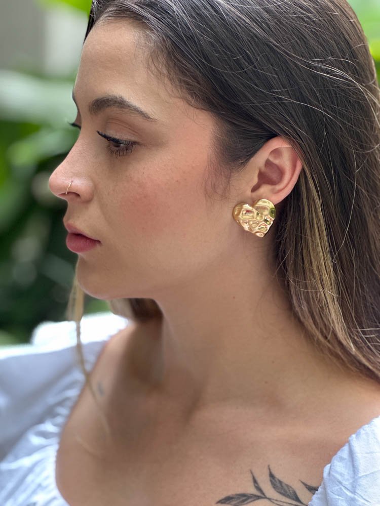 Los aretes Corazón Vivo destacan por su diseño robusto y texturizado, que rompe con la idea tradicional del corazón liso y simétrico. Su acabado con relieve le da movimiento y carácter, evocando la vitalidad y la energía de un corazón palpitante. Tienen un tamaño mediano a grande, alrededor de 2,5 a 3 cm de alto, perfectos para ser protagonistas en tu look. Ideales para quienes buscan accesorios que transmitan personalidad y a la vez mantengan un toque romántico pero moderno.