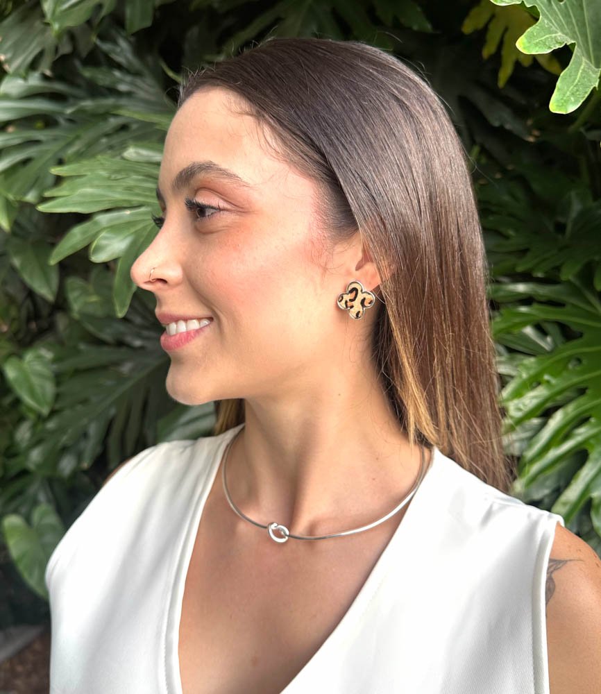 Los topos Fiera unen la delicadeza de la silueta tipo trébol con la energía salvaje del animal print. Su diseño atrevido enmarca la feminidad con un aire de seguridad y carácter, siendo el complemento ideal para quienes aman piezas llamativas que elevan cualquier look. El borde plateado aporta un contraste elegante, destacando aún más su textura única.