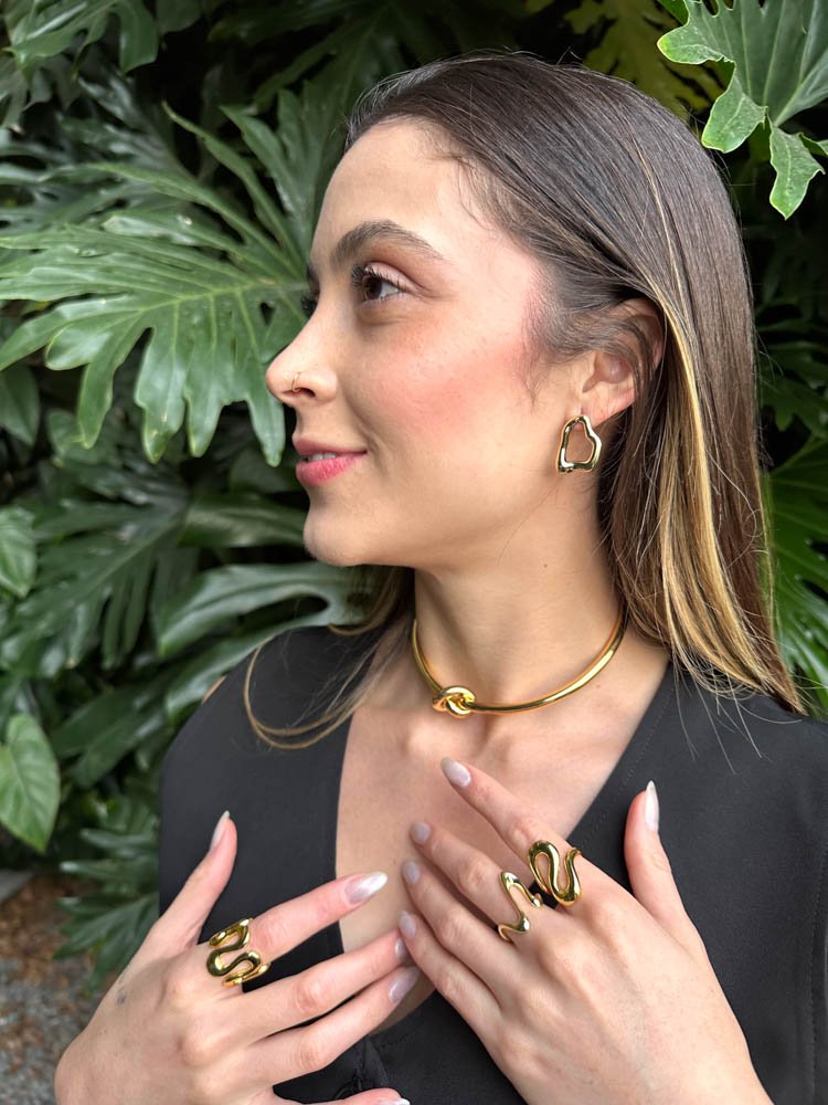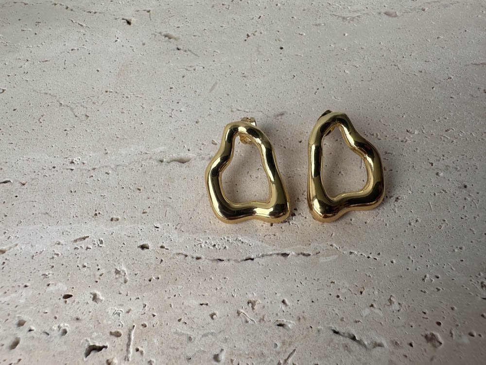 Los aretes Olas están elaborados en rodio con acabado dorado, destacando por su diseño irregular y fluido que recuerda las formas naturales del agua y el movimiento de las olas. Su acabado brillante aporta sofisticación y un toque contemporáneo que los hace perfectos para quienes buscan un accesorio versátil con personalidad. Tienen un tamaño aproximado de 3 a 3,5 cm de alto, ideal para lucir llamativos sin resultar pesados, y cuentan con cierre de presión para mayor comodidad y seguridad.